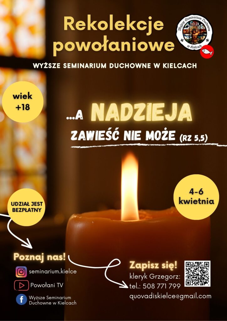 Wyższe Seminarium Duchowne w Kielcach organizuje w dniach 4-6 kwietnia 2025 roku Rekolekcje powołaniowe dla młodzieży męskiej od 18 roku życia pod hasłem „… A nadzieja zawieść nie może” (Rz 5,5)… …więcej…